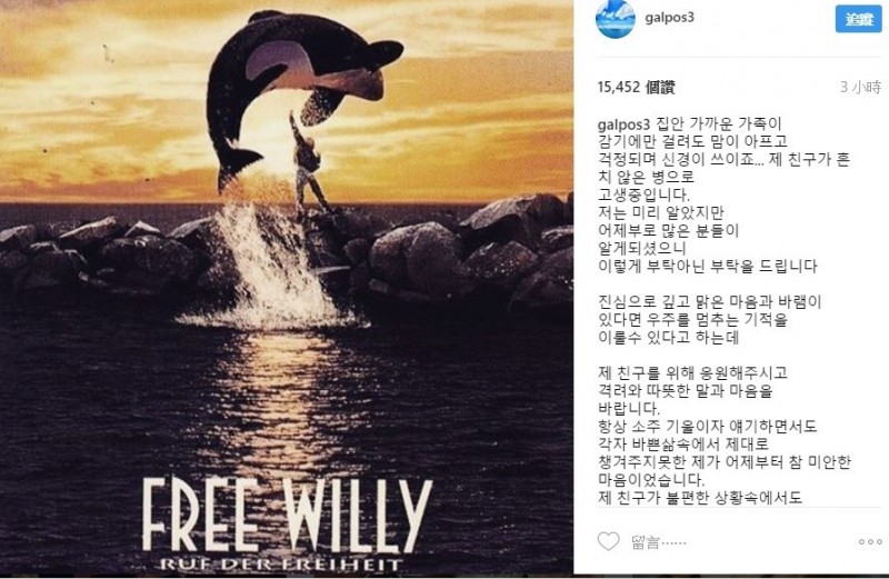 姜河那先是透露,家中親近的親人就算只是得了感冒都會很擔心,而自己的朋友正因為罕見的疾病受苦,希望大家能以溫暖的心意及言語,為金宇彬加油打氣。姜河那接著表示,過去兩人常相約喝燒酒,但因為各自忙於工作,讓他從昨天起就感到十分抱歉,自責沒有好好照顧金宇彬,希望好友在身體不適的情況下,仍然能保持風趣幽默,每天以笑容度日,最後他感性表示,「大家的祈願,我也會一起祈求,宇彬呀!我愛你!加油,要一直保持笑容喔。」並附上電影《威鯨闖天關》的劇照,似乎藉此鼓勵好友成功對抗病魔。